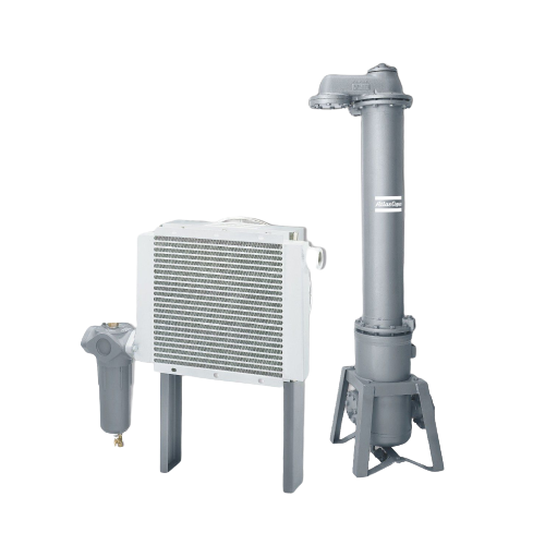 An after-cooler is a heat exchanger, which cools the hot compressed air to precipitate the water that otherwise could condensate in the pipe system. It is water of air cooled, generally equipped with a water separator with automatic drainage and should be placed next to the compressors.